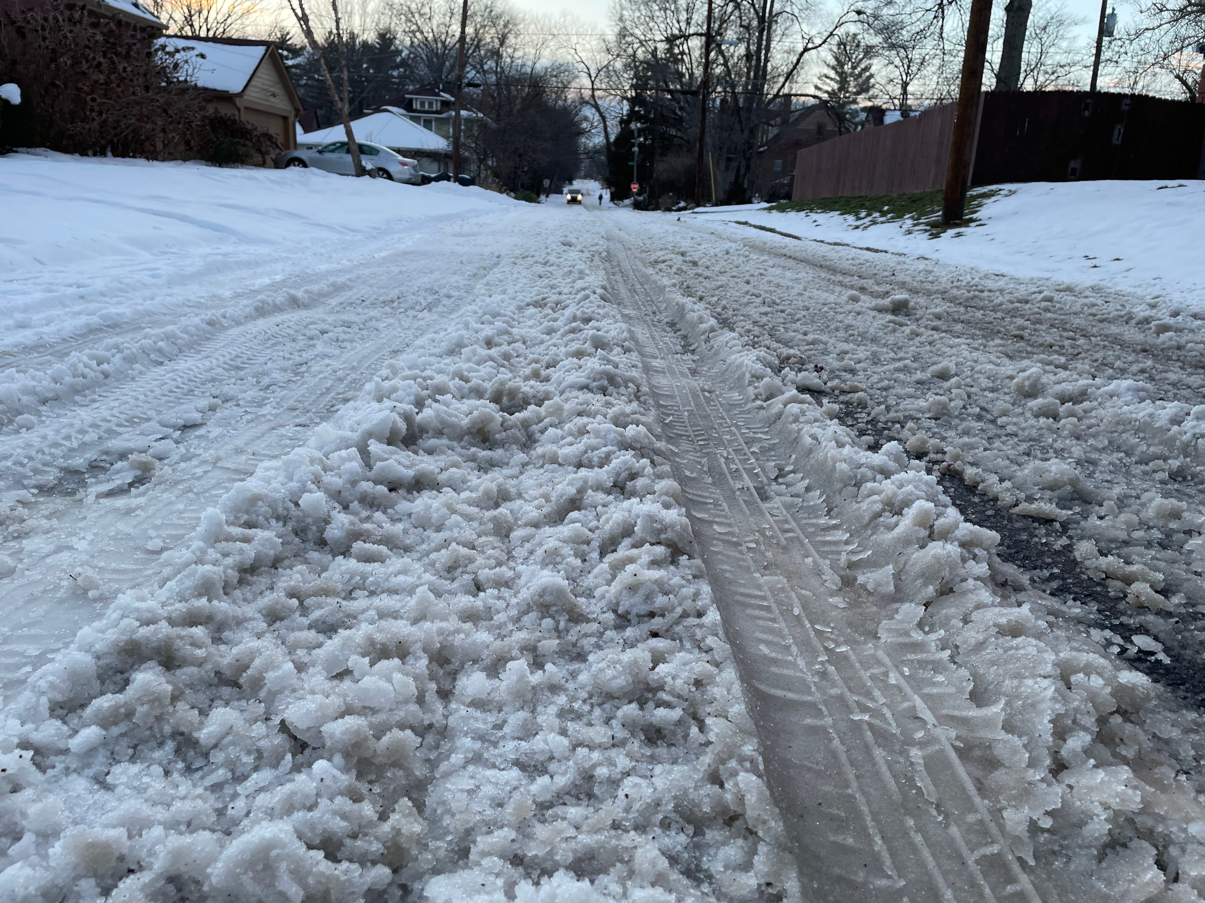 As you can also see in this photo, the city did plow snow. Thankfully, we live on a “connector” street, which means the pavement directly in front of our house is clear. The problem is, we have to turn onto streets (see above) still filled with snow and ice.
