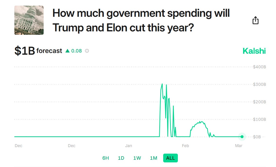 Betting markets, which is to say people who are willing to put their own money on the line to back their predictions, say no. Elon Musk’s DOGE will cut less than $1 billion from the federal budget, bettors say, reflecting plunging expectations.